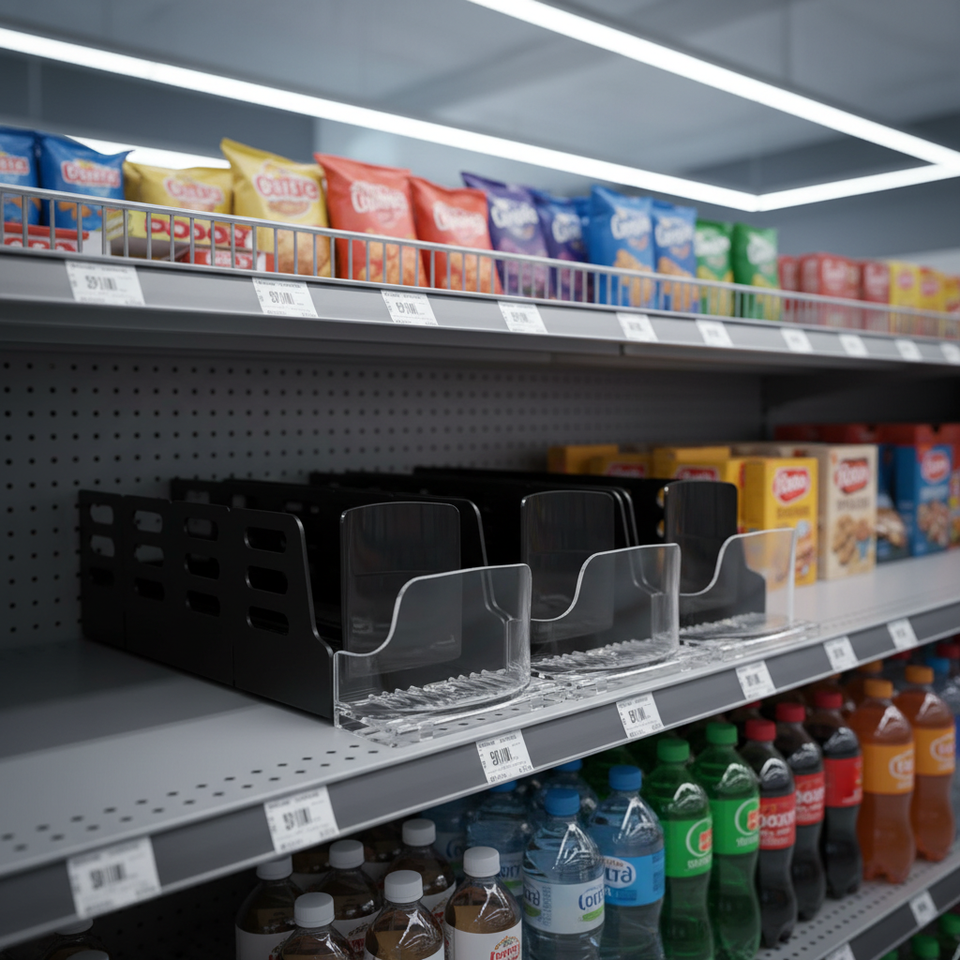 ระบบดันสินค้าบนชั้นวางสำหรับบุหรี่ เครื่องดื่ม เบียร์ และแพ็ค