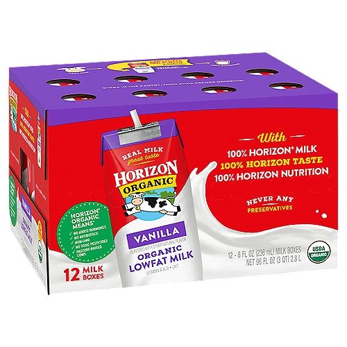 ฮอริซอน ออร์แกนิค เรด 8 ออนซ์ กล่องนมวัวพาสเจอร์ไรส์ PET พร้อมหูหิ้ว บรรจุ 12 กล่อง สำหรับเด็กอายุ 0-12 เดือน