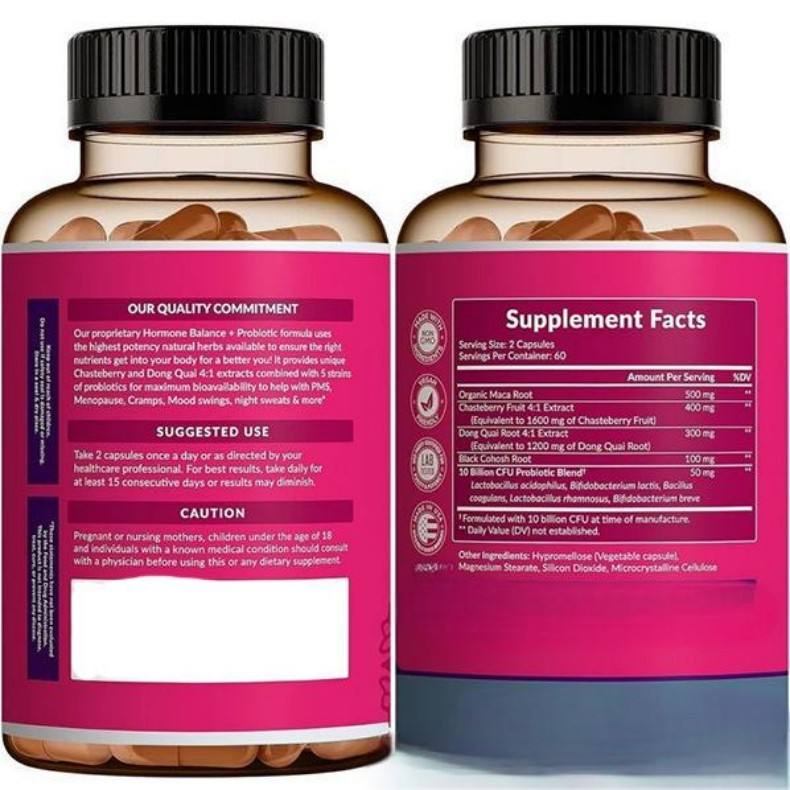 รากมาคาออร์แกนิก, สารสกัดจากผลไม้ Chasteberry 4:1, สารสกัดจากรากตงควาย 4:1, รากแบล็คโคฮอช, โปรไบโอติกผสม 10 พันล้าน CFUส่วนผสมหลัก