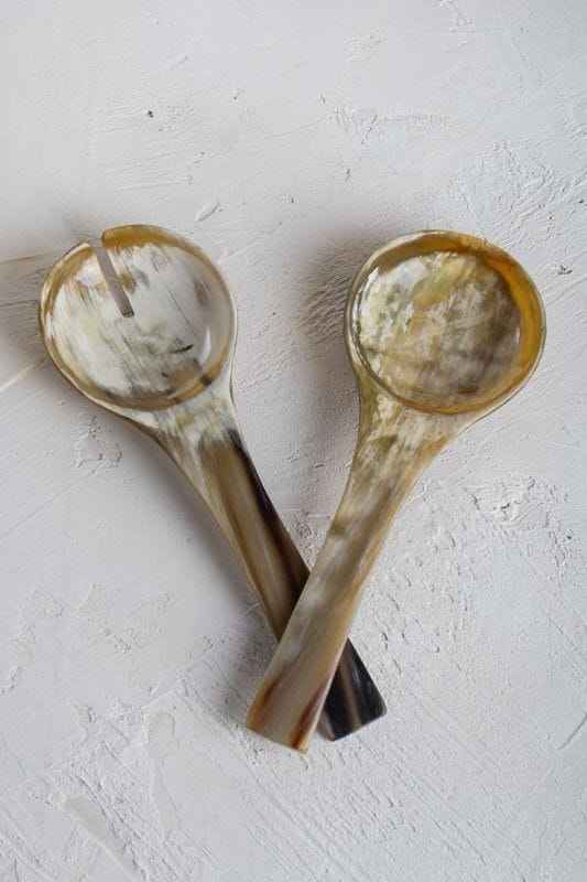 ชุดช้อนฮอร์นธรรมชาติทำด้วยมือคุณภาพสูง2ชิ้นขัดเงาด้วยกระจกเหมาะสำหรับใช้ในบ้านและร้านอาหาร