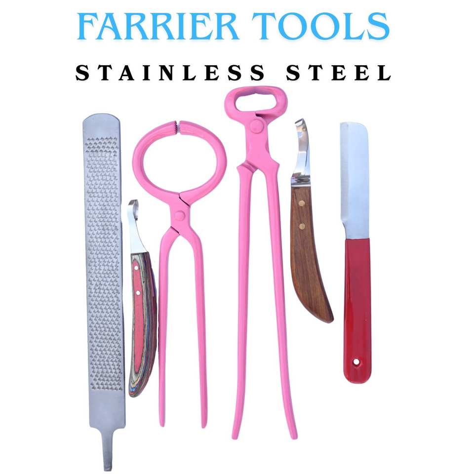 ชุดเครื่องมือตัดแต่งกีบม้า สแตนเลส พร้อมอุปกรณ์ทดสอบความเจ็บปวดของกีบม้า มีดตัดแต่งกีบม้า 15 นิ้ว ตะไบกีบม้าโค้ง