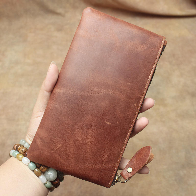 กระเป๋าใส่โทรศัพท์หนังม้าหนังวัวทรงยาวสไตล์เรโทรบางเฉียบกระเป๋าสตางค์หนังแท้สำหรับผู้หญิงแบบคลัทช์สไตล์ญี่ปุ่นและเกาหลี