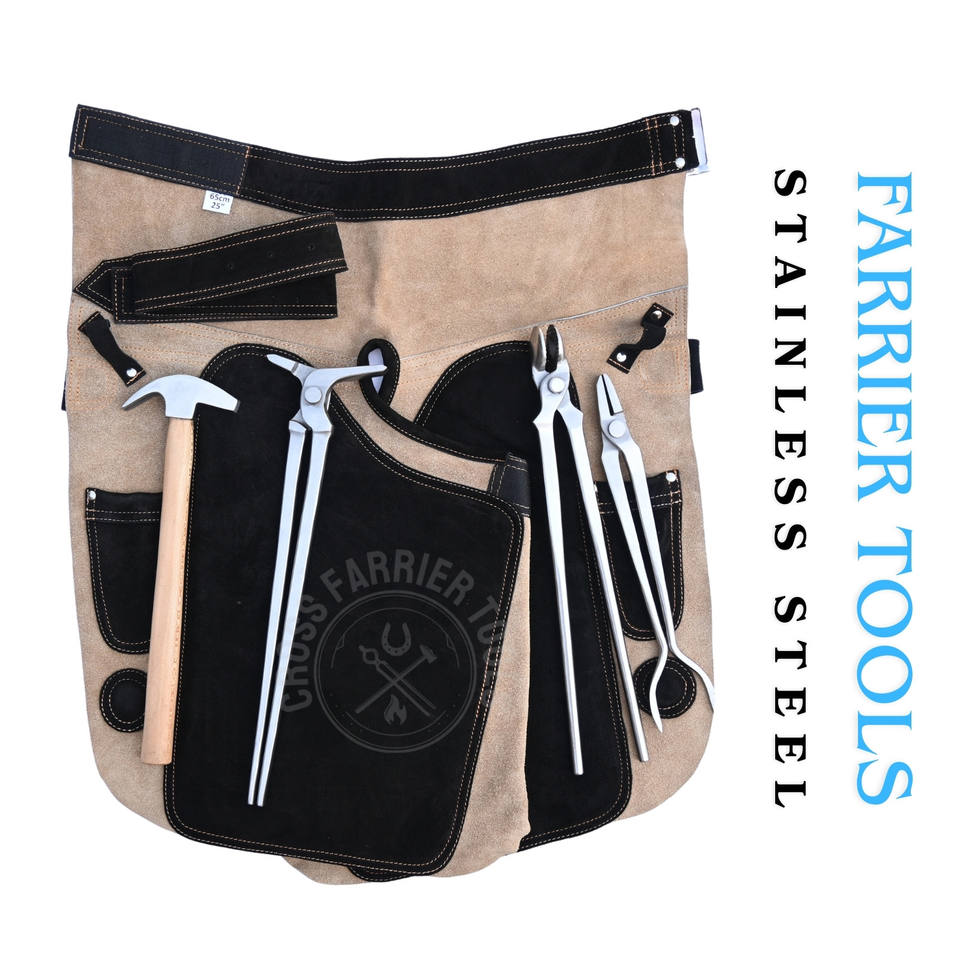 ชุดอุปกรณ์ตีเกือกม้า พร้อมผ้ากันเปื้อนช่างตีเกือก ค้อนตีกีบม้า ที่ถ่างกีบม้า คีมปากกลม คีมดึงเหล็ก และเครื่องมือยึดกีบม้า