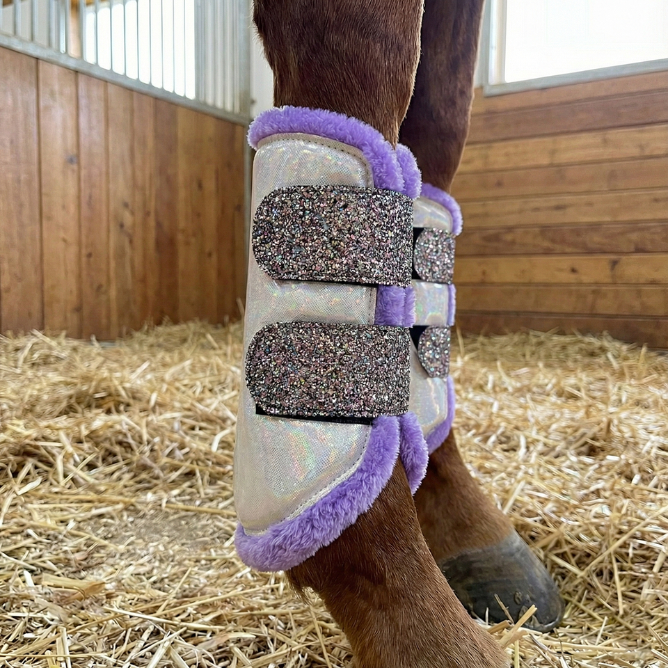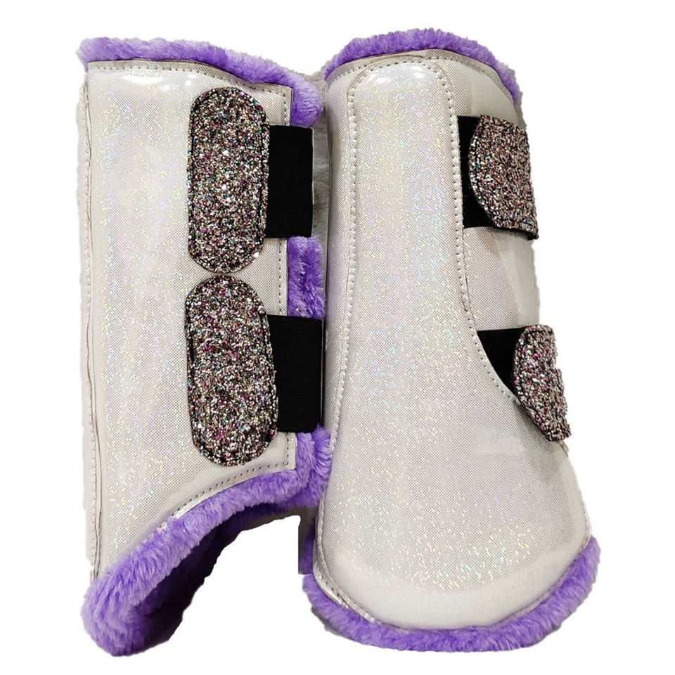รองเท้าป้องกันขาสำหรับม้า สีขาว-ม่วง ขนเทียม สายรัดแบบกลิตเตอร์ ปรับแต่งสีได้ คุณภาพสูง สำหรับการฝึกขี่ม้า
