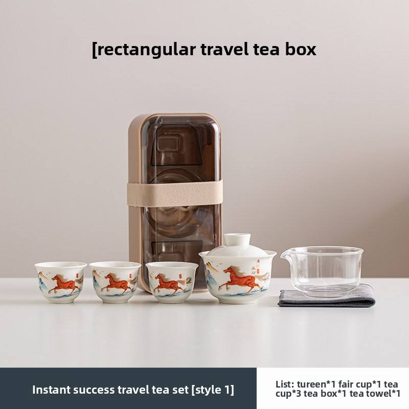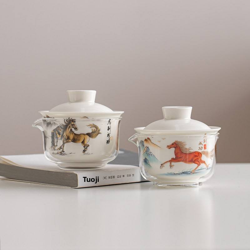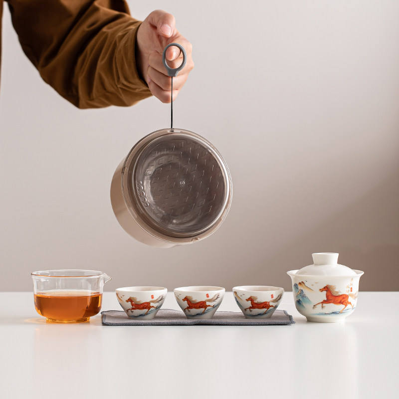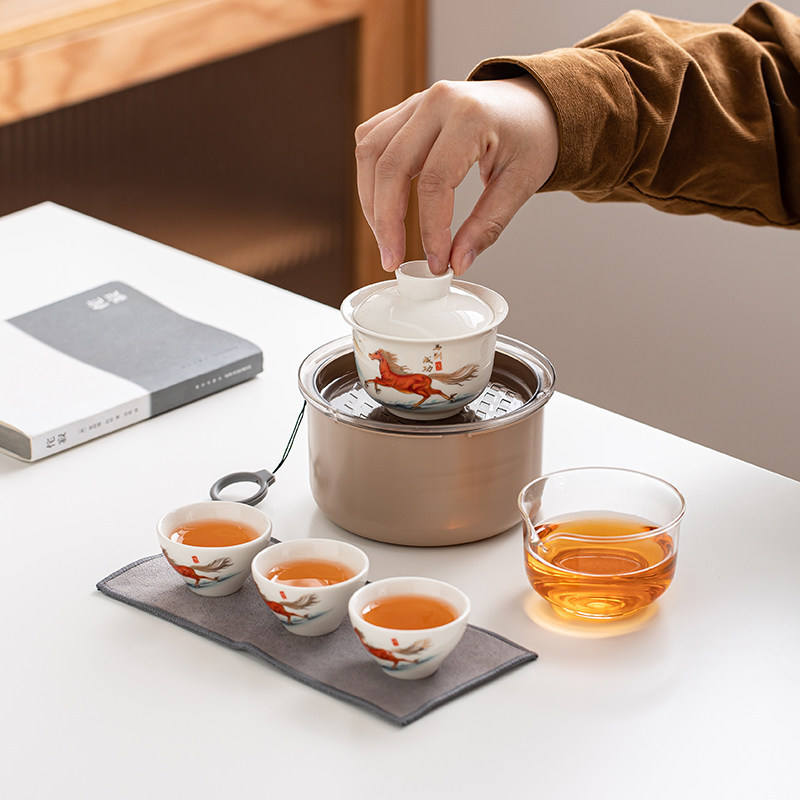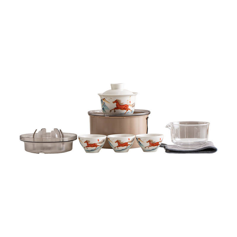 ชุดน้ำชาพกพาสำหรับเดินทาง ลายม้า ปีนักษัตร เหมาะสำหรับใช้ในรถยนต์ ชามมีฝาปิด ถ้วยชาเซรามิก ถ้วยสำหรับแขก ชุดกาน้ำชาหนึ่งใบ ถ้วยสามใบ