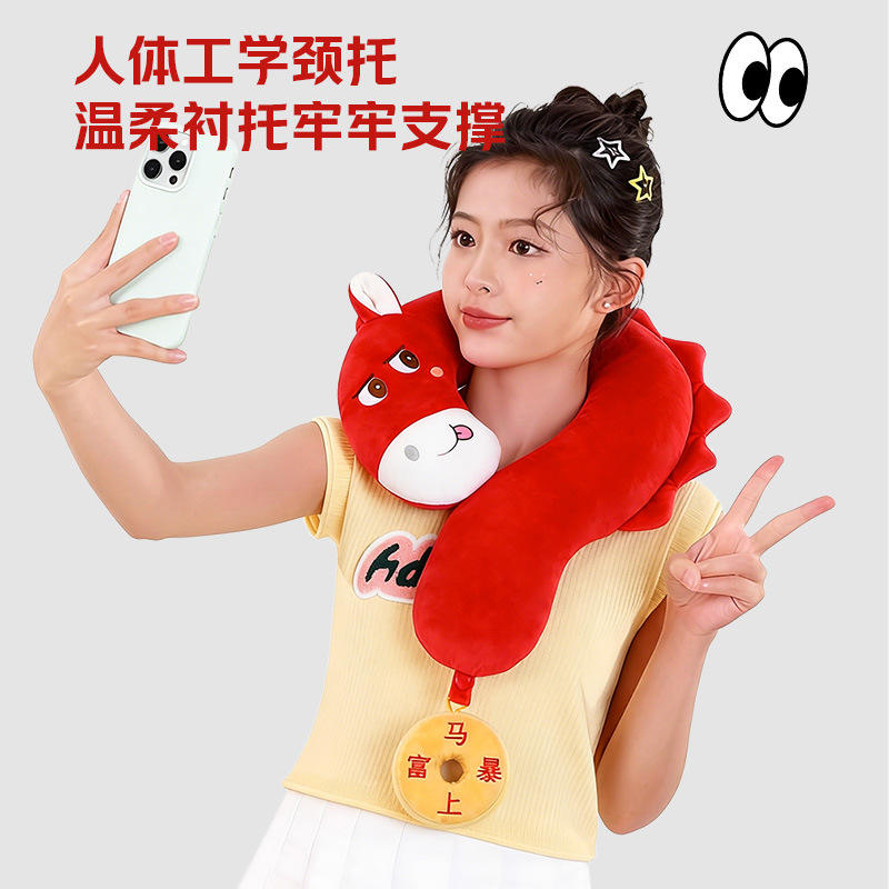หมอนรองคอรูปตัวยูสำหรับปีม้า ใช้ได้สองแบบ ดีไซน์รูปสัตว์น่ารัก นุ่มสบาย เหมาะสำหรับการเดินทาง เพื่อการรองรับที่สบายและผ่อนคลาย