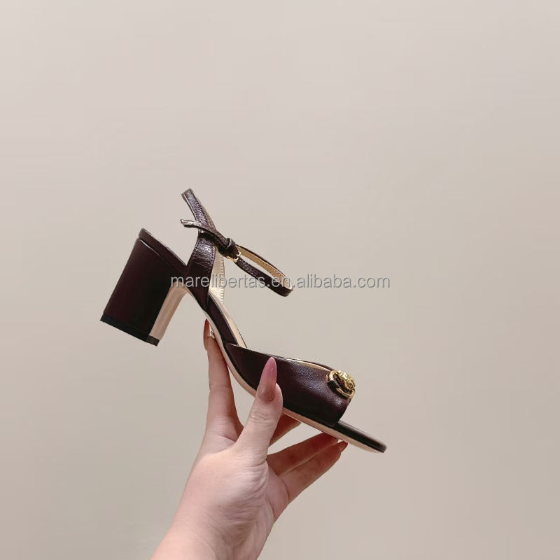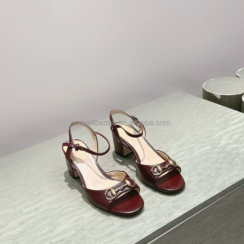 รองเท้าส้นสูงทรงเหลี่ยม Horsebit หนังวัวสีน้ำตาล ส้นหนา พื้นรองเท้าหนังแท้อิตาลี สไตล์เรโทร สง่างาม ทันสมัย