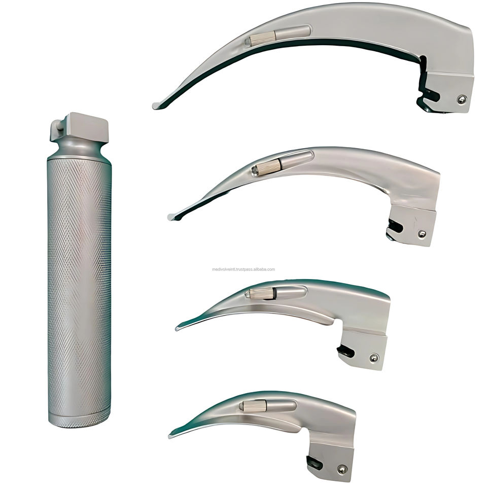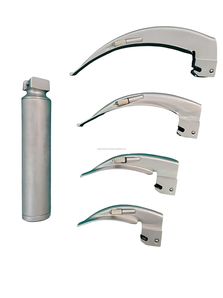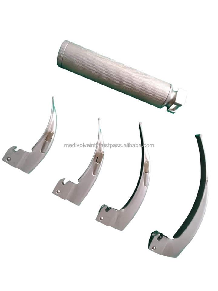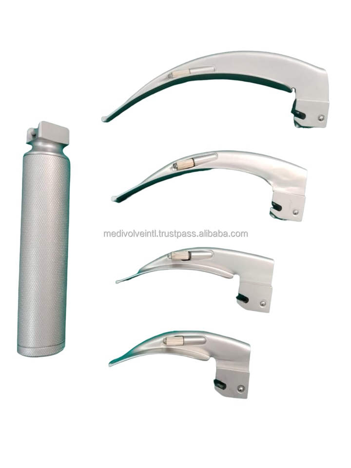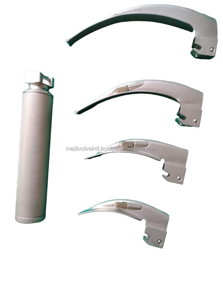 ชุดเครื่องมือส่องกล่องเสียงไฟฟ้าแบบ LED เกรดโรงพยาบาล ผลิตจากสแตนเลส ยี่ห้อ Macintosh พร้อมใบมีด 4 แบบ สำหรับการจัดการทางเดินหายใจ ได้รับมาตรฐาน CE ISO OEM ODM Medivolve รับประกัน 1 ปี