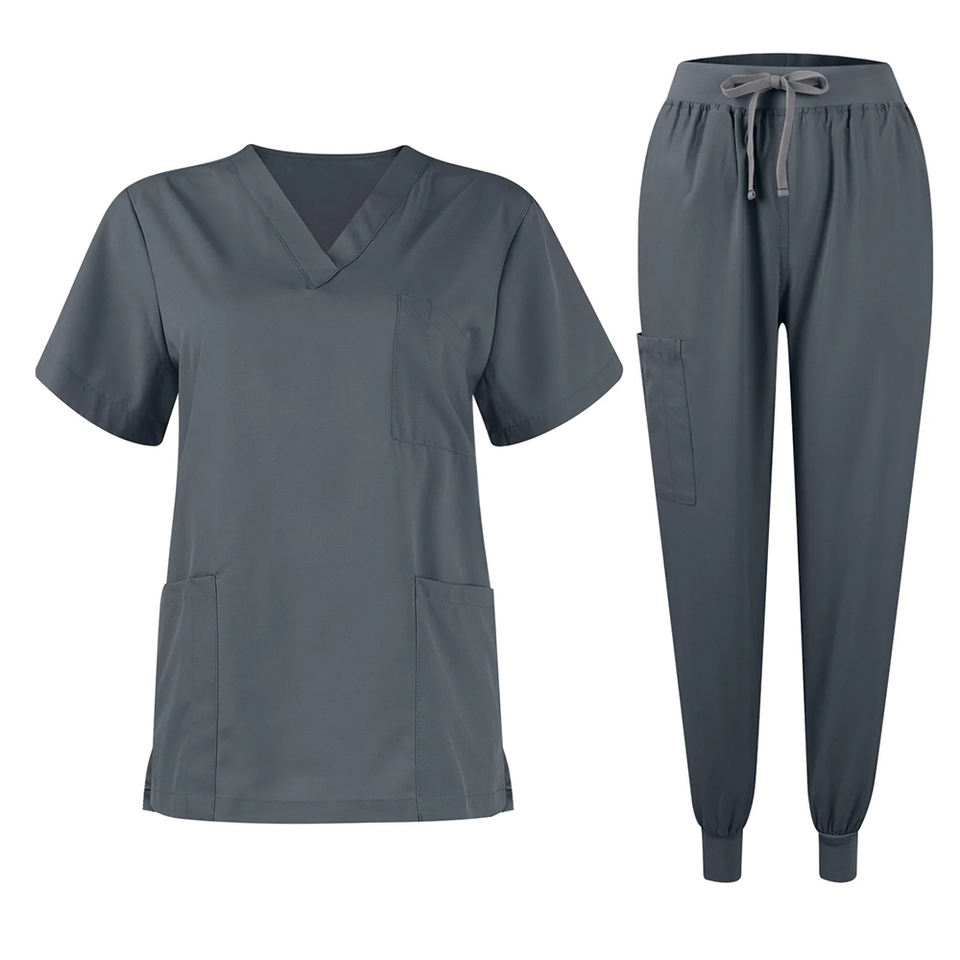 ชุดสครับสำหรับแพทย์ผ่าตัดในโรงพยาบาลชุดสครับผ้ายืดสีเทาอ่อนชุดสครับพยาบาลหญิงพร้อมบริการ OEM