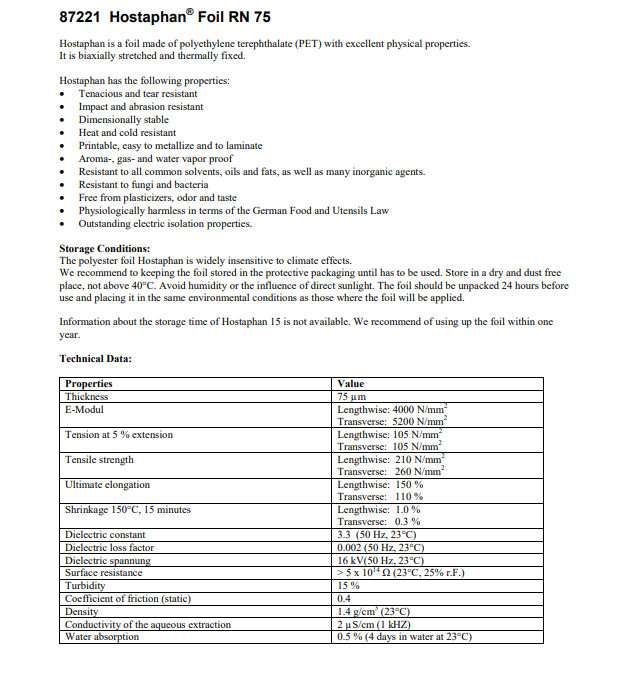 ฟิล์มโพลีเอทิลีนอีร์ฟทาเลต (PET) แบบมีแกนคู่ โฮสตาฟาน วัสดุฉนวนไฟฟ้า RNK RN WN FILM