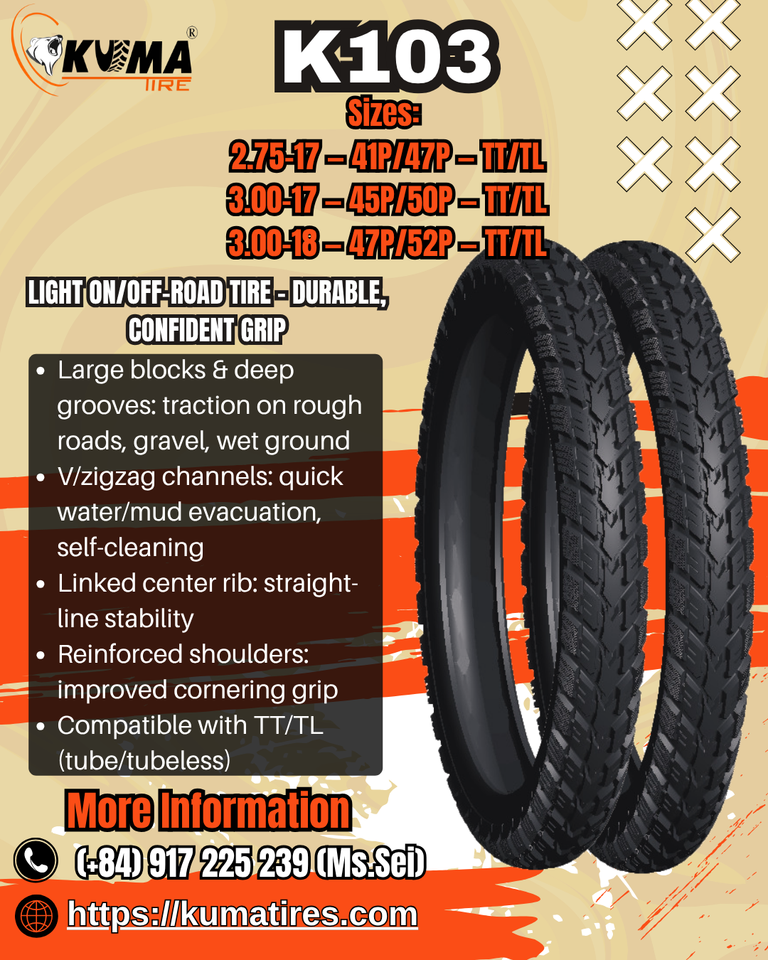 ยางรถจักรยานยนต์คุณภาพสูง KUMA K103 ผลิตในเวียดนาม ปี 2026 ยางใหม่ ยางธรรมชาติ + ไนลอน ขนาด 2.75-17/3.00-17/3.00-18