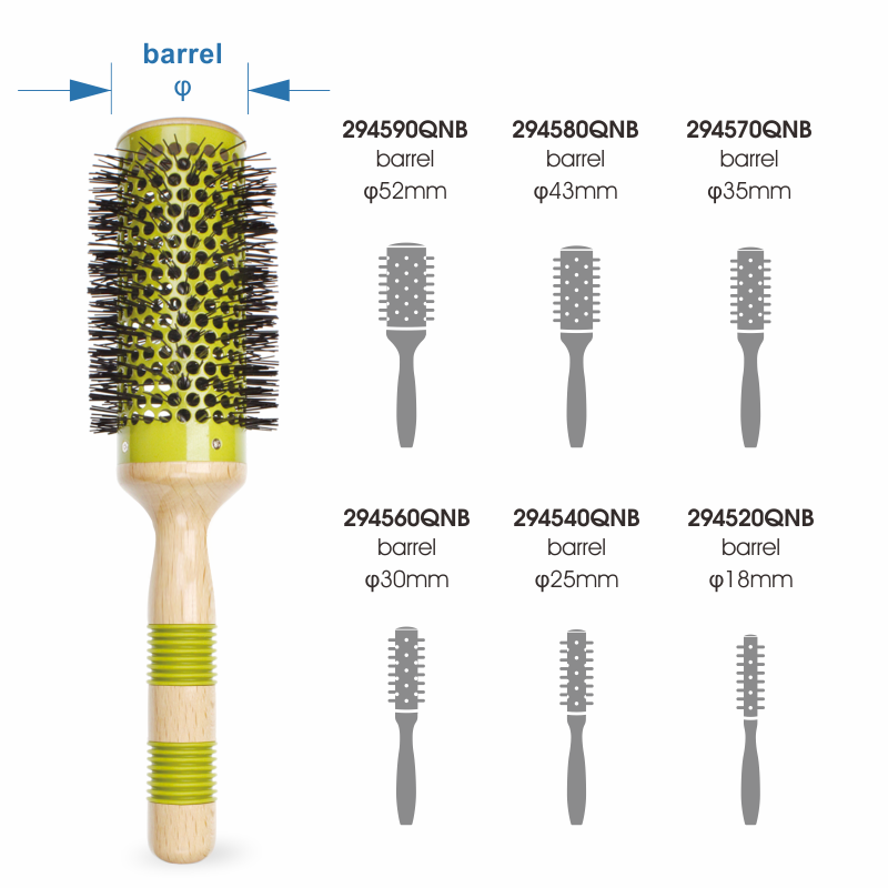 แปรงกลมด้ามจับทำจากไม้ม้วนร้อนกระบอกระบายอากาศเคลือบเซรามิกแห้งเร็วและขนแปรงไนล่อนไอออนิกสำหรับใช้ในร้านเสริมสวย