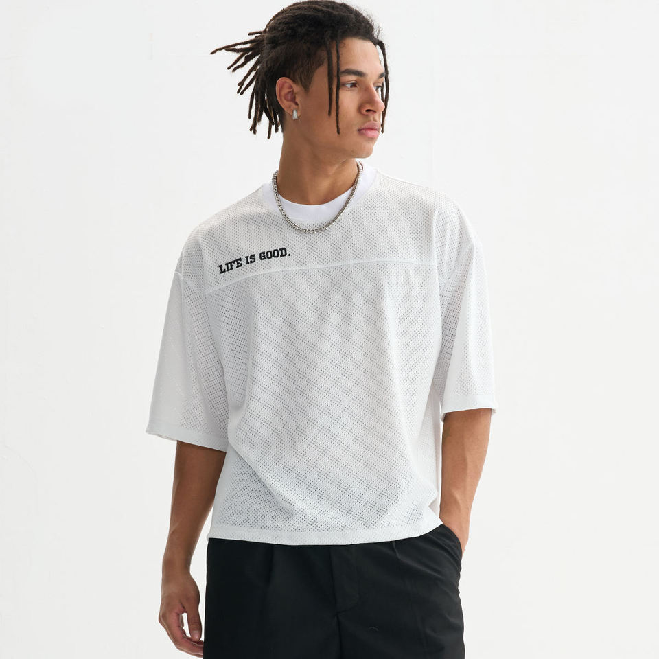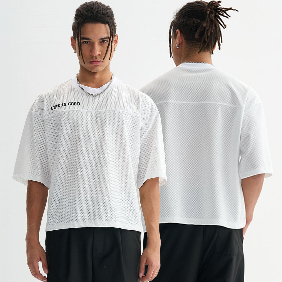 เสื้อยืดกีฬาผู้ชายผ้าโพลีเอสเตอร์ตาข่าย100% พรีเมี่ยมแขนสั้นแนวสตรีทสั่งทำโลโก้ได้