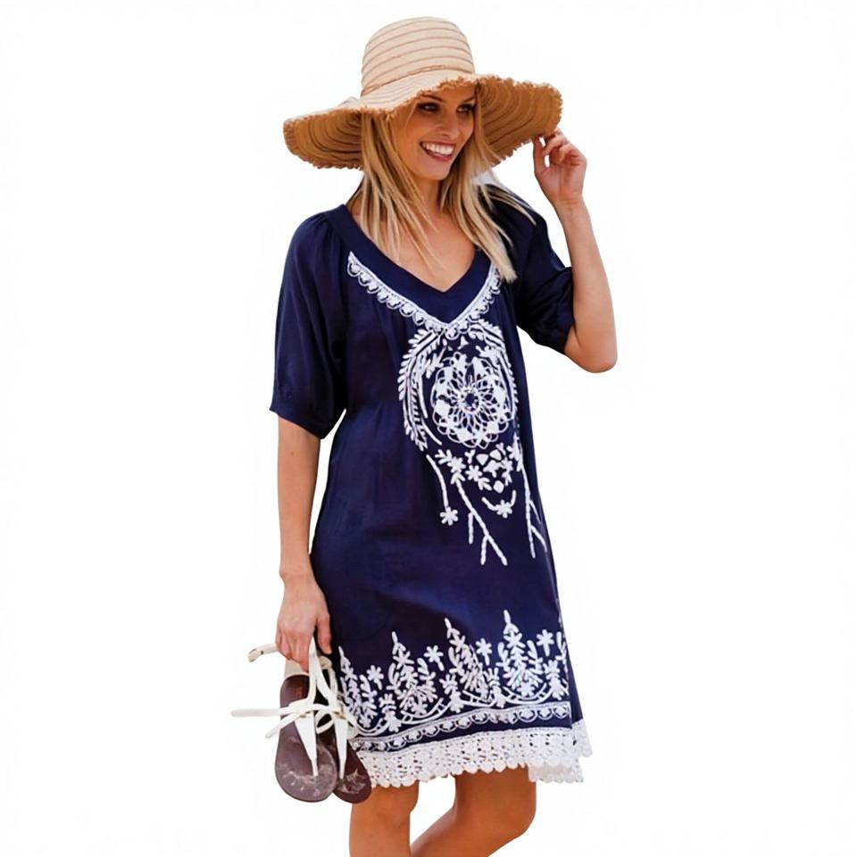 สาวๆสุดฮอตสวมใส่เสื้อทูนิคปักลายดอกไม้สไตล์โบฮีเมียนสวยงามด้วยผ้าลูกไม้ Aari ที่เป็นมิตรกับสิ่งแวดล้อม รุ่นใหม่ปี 2026 ชุดชายหาดแบบสั้น