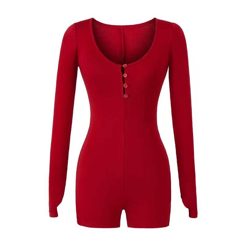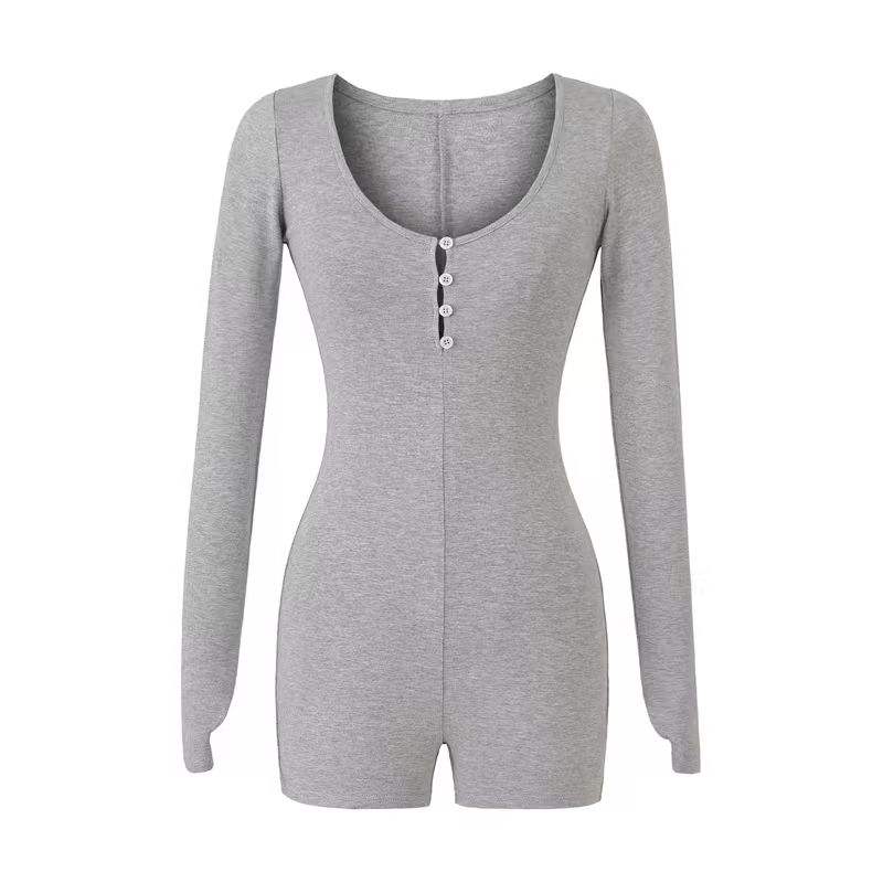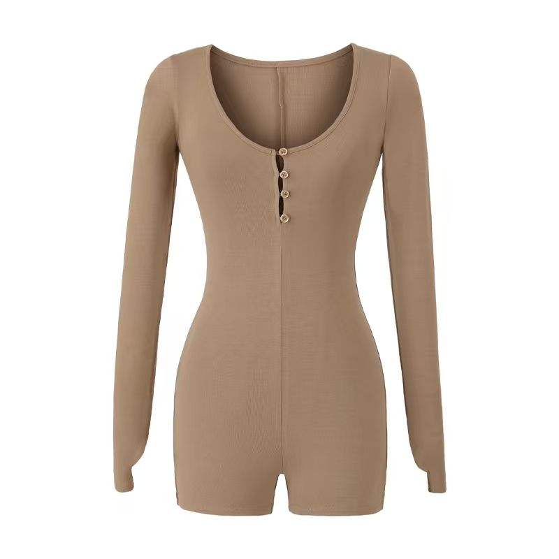 จั๊มสูทแขนยาวคอกลมแขนยาวสำหรับผู้หญิงบอดี้คอนกระดุมใหม่สำหรับฤดูใบไม้ร่วง/ฤดูหนาวสไตล์อเมริกัน