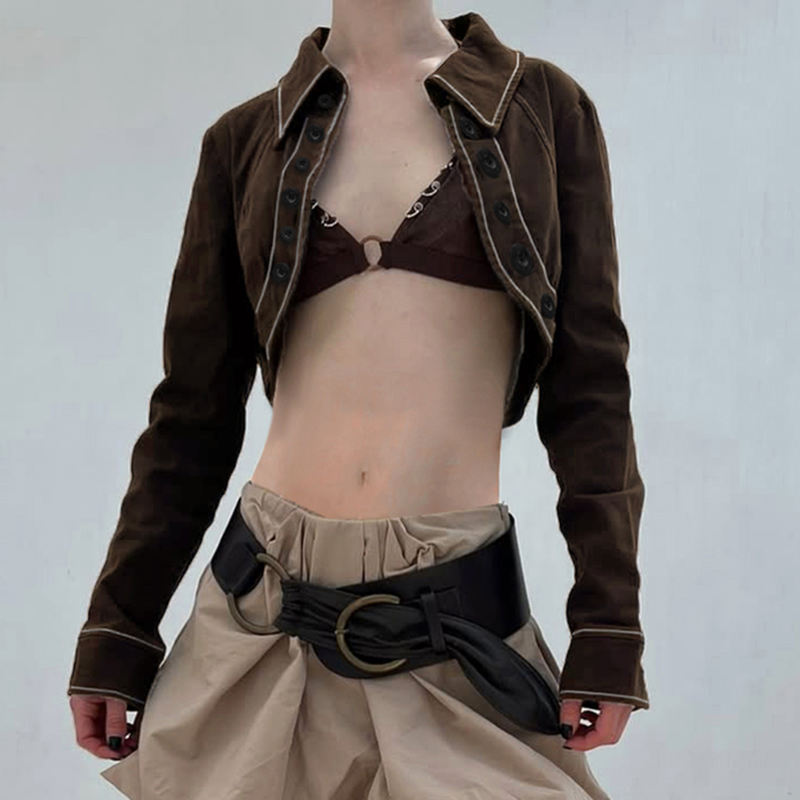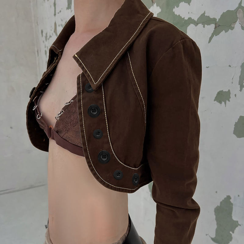 เสื้อแจ็คเก็ตยีนส์ครอปสไตล์สตรีทแวร์สำหรับสาวฮอต ติดกระดุมด้านหน้า คอปกสุดเท่ แฟชั่นแขนยาว กันลม