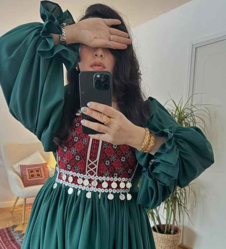 ชุดเดรสปักมือสไตล์อัฟกันคูชี สีเหลืองและเขียว พร้อมผ้าคลุมไหล่หลากสีสัน ปักลายอย่างประณีต