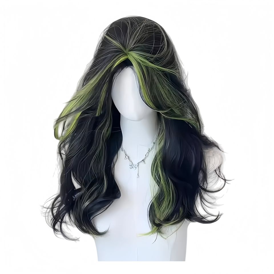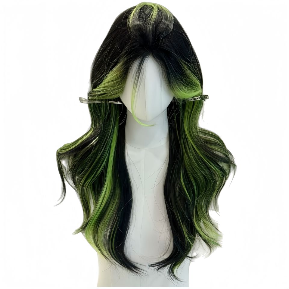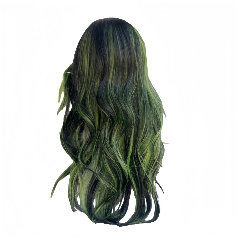 วิกผมยาวลอนคลื่นสีดำและเขียวไฮไลท์