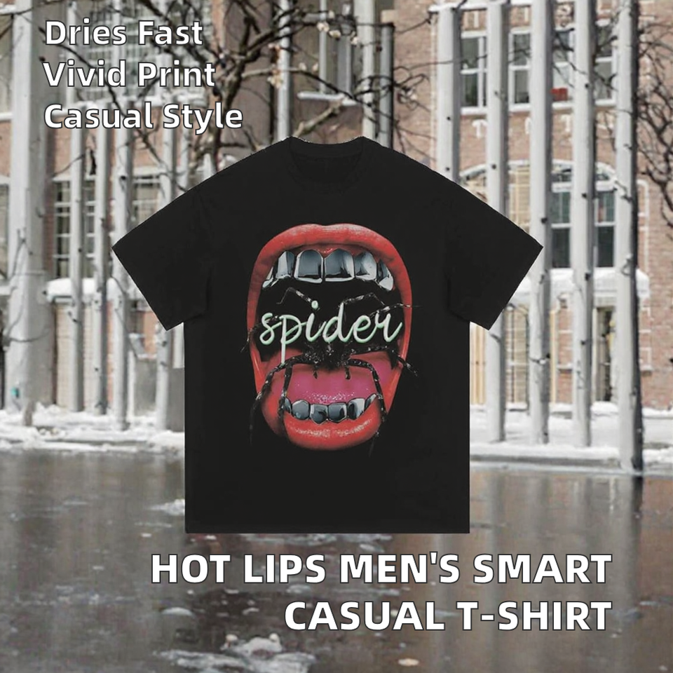 เสื้อยืดผู้ชาย Hot Lips สไตล์สมาร์ทแคชชวล ผ้าโพลีเอสเตอร์ 100% ทรงปกติ พิมพ์ลายดิจิทัล แห้งเร็ว กันยับ ดีไซน์สตรีทแวร์สุดเท่