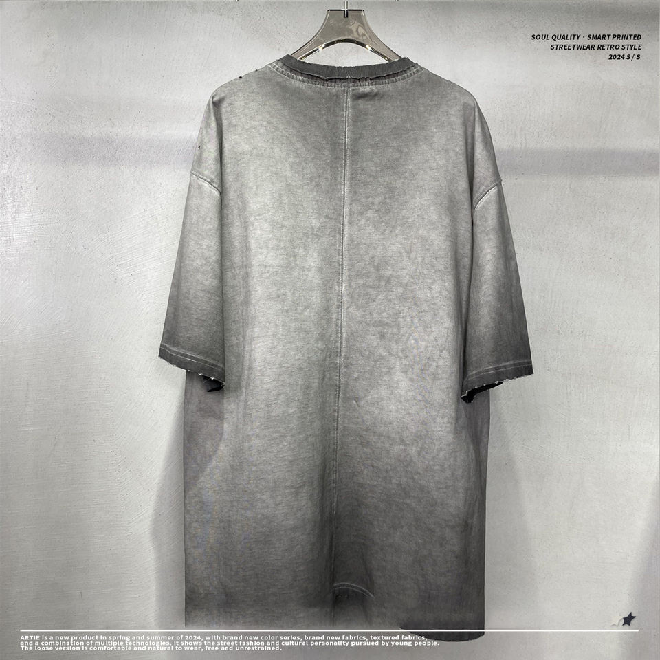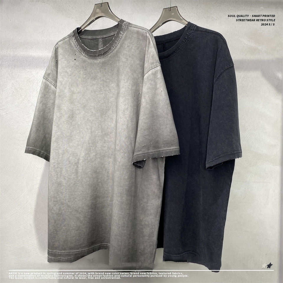 Hot New Product Anti-Fried Color Dispersion Side Cut Holes Retro T-Shirt Men's Loose Short-Sleeved