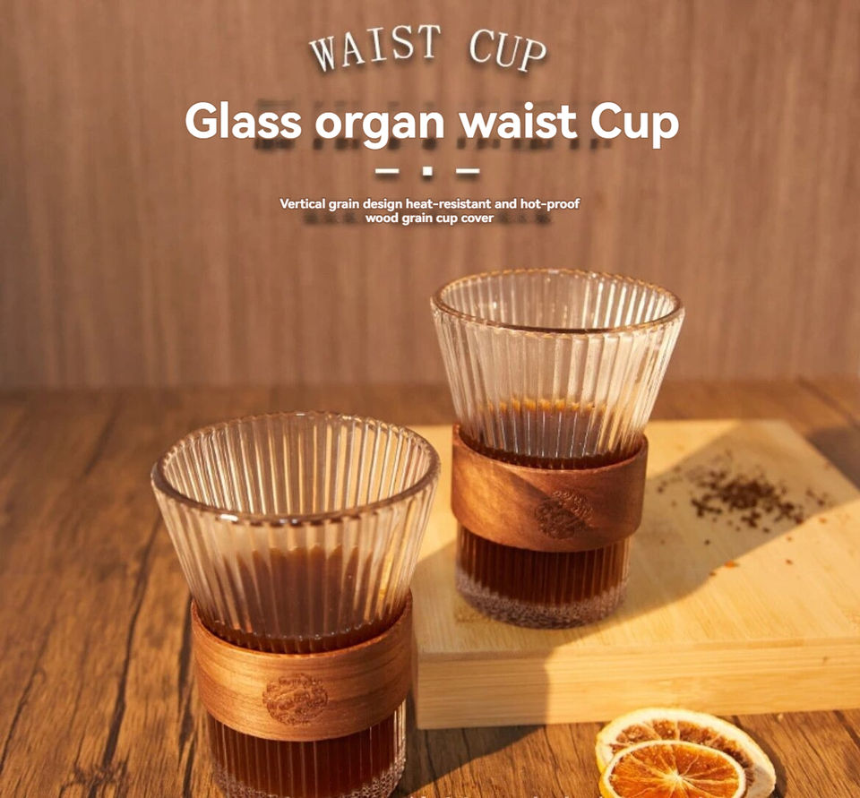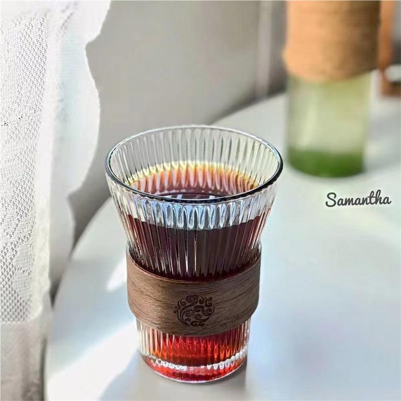 แก้วกาแฟลายแนวตั้งทรงเอวสูง ดีไซน์สวยงาม แก้วน้ำชา น้ำผลไม้ ลายไม้ สำหรับสำนักงาน เก็บความร้อนได้ดี