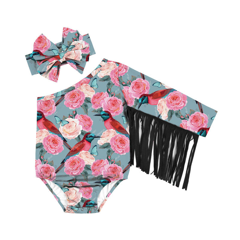 ชุดรอมเปอร์เด็กผู้หญิงแบบไหล่เดียว ลายพิมพ์น่ารัก ผ้าไหมนม สำหรับฤดูร้อน ชุดบอดี้สูทเด็กทารก แต่งพู่ห้อย ขายส่ง