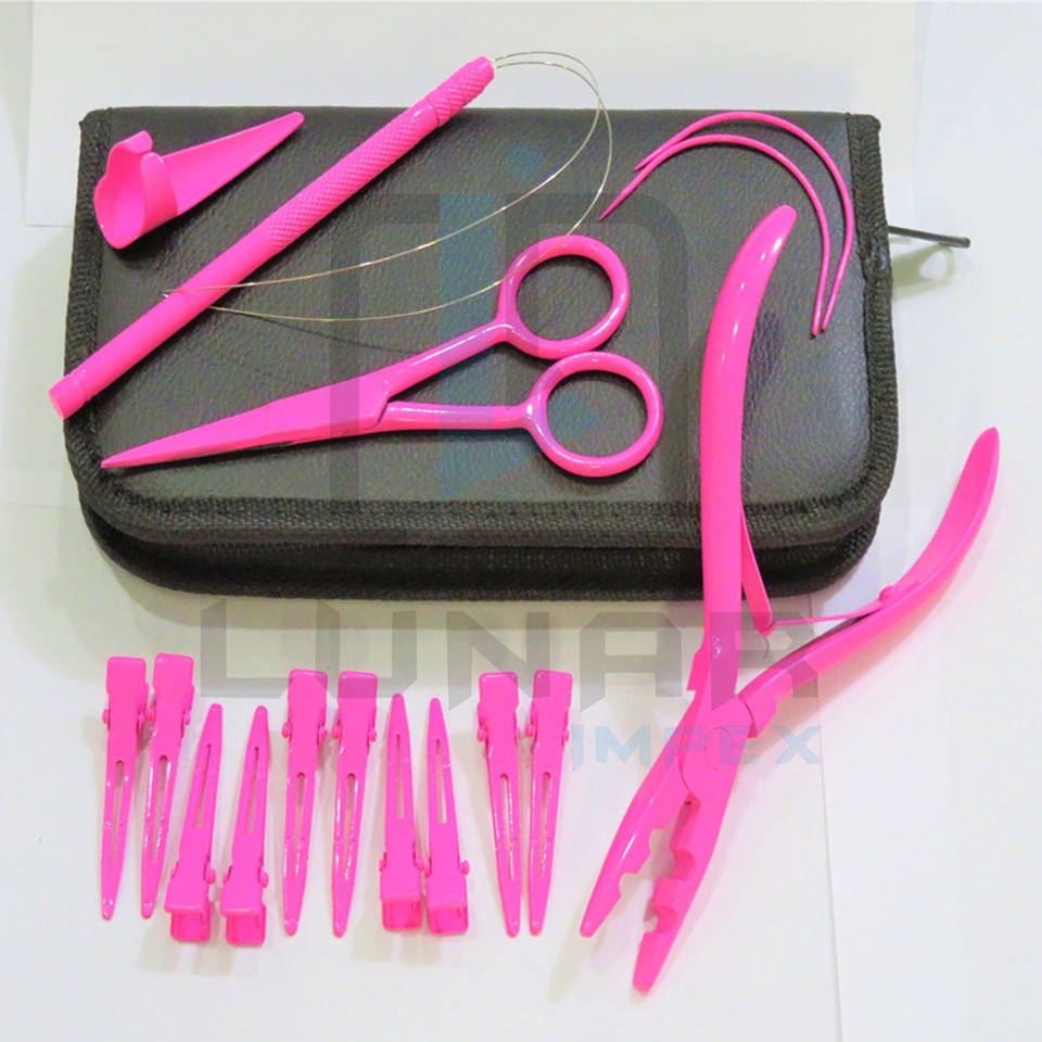 Hot Pink Color Hair Extension Tools With Black PVC Leather Case Kit and Providing Free Custom Brand Labelling