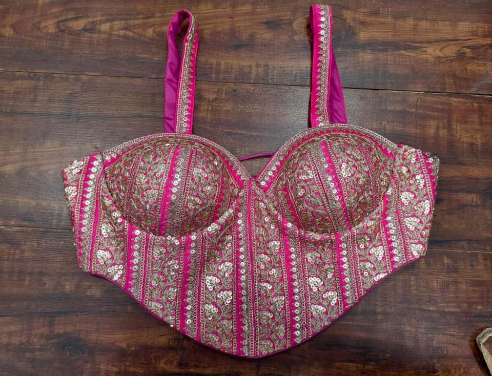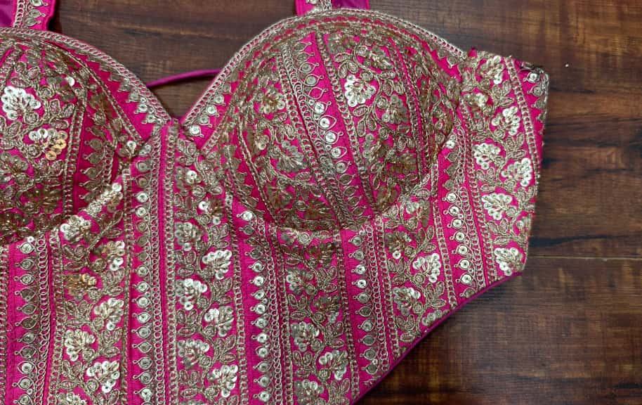 เสื้อส่าหรีเจ้าสาวสีชมพูสด ปักลายหนัก ประดับด้วยงานปักดิ้นทองและเลื่อม