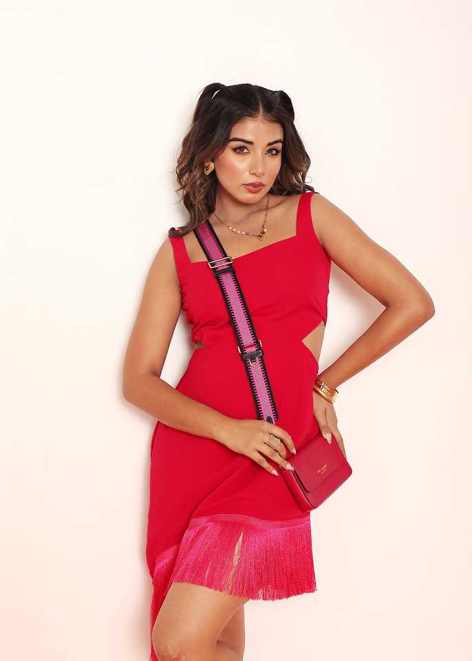 เดรสสีชมพูสดแบบเว้าข้างแต่งชายรุ่ยสำหรับผู้หญิง โดดเด่นด้วยทรงเข้ารูป ผ้าเนื้อบางเบา ใส่สบายและมีสไตล์