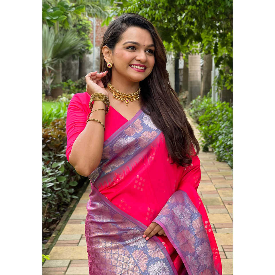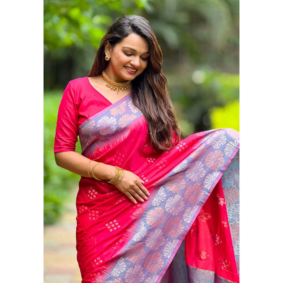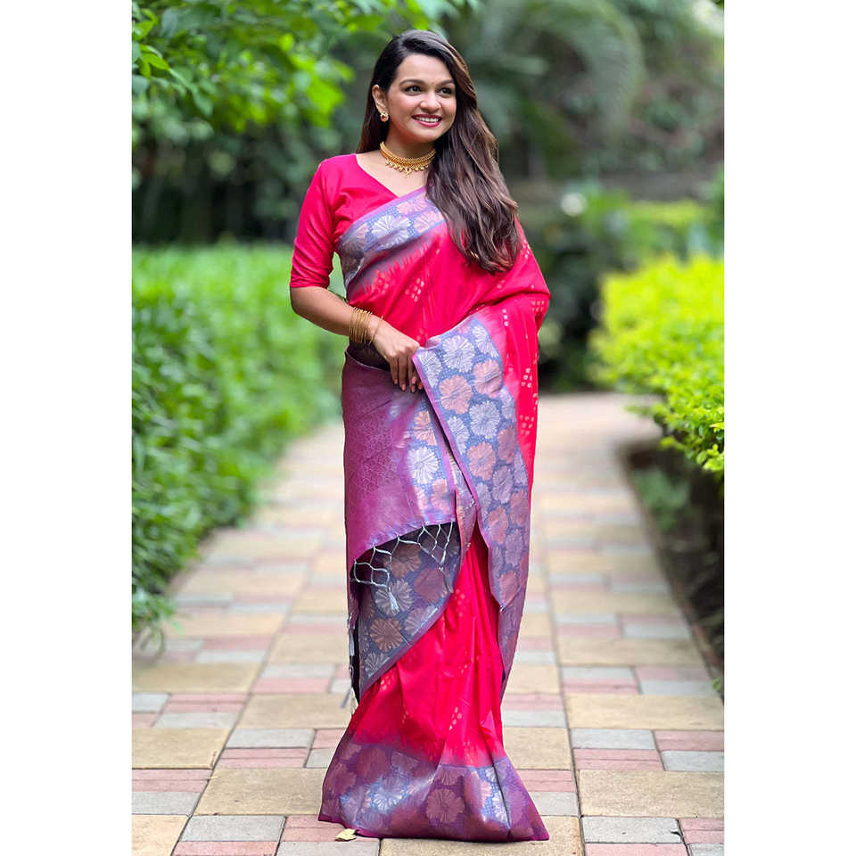 ผ้าซารีสีชมพูสดใส ผ้าไหมเนื้อนุ่ม แต่งขอบลายดอกไม้หรูหรา พร้อมลายปักดิ้นทอง สำหรับงานพรอมและป้องกันแสงแดด