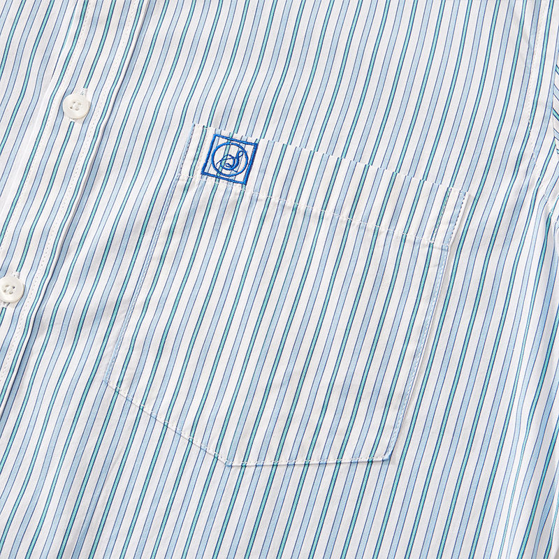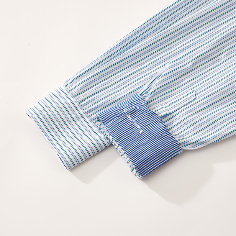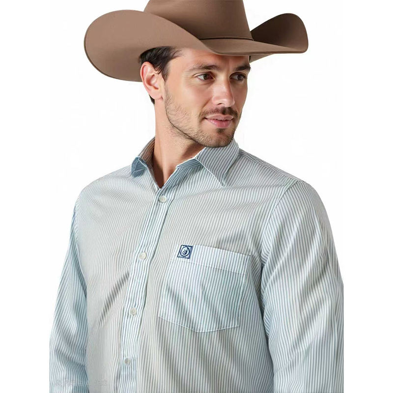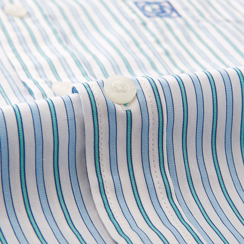 เสื้อเชิ้ตแขนยาวผู้ชายลายทางสีน้ำเงินกรมท่า ผ้าฝ้าย 100% ย้อมเส้นด้าย สไตล์สบายๆ ปักลาย ปกพับ ลดราคาพิเศษ