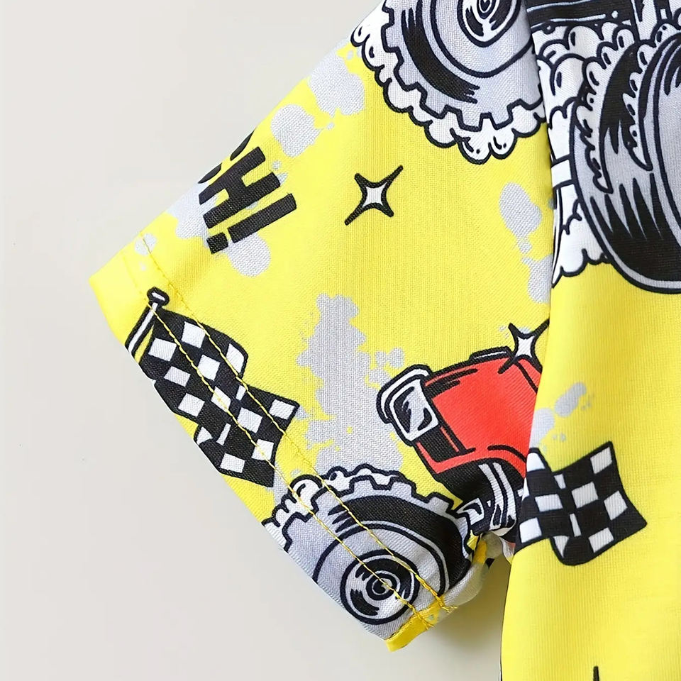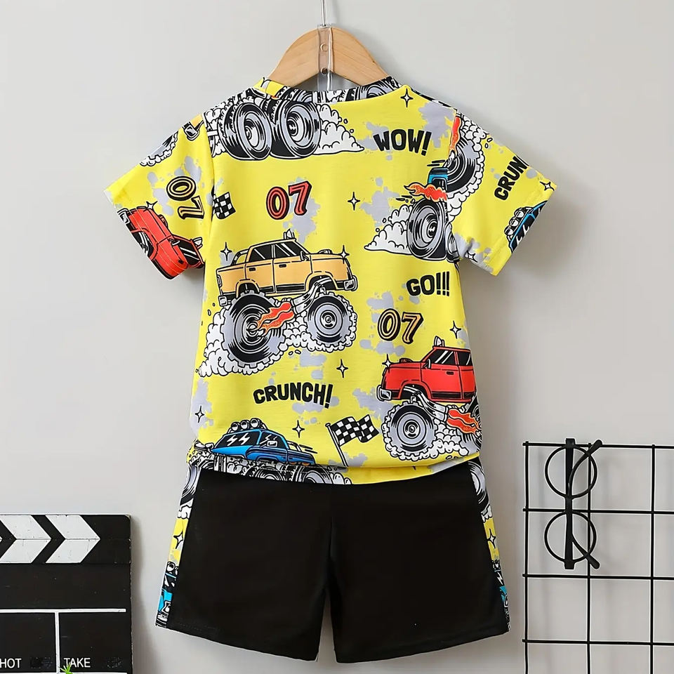 ชุดกางเกงขาสั้นแขนสั้นพิมพ์ลายตัวอักษรสีเหลืองสําหรับเด็กผู้ชาย