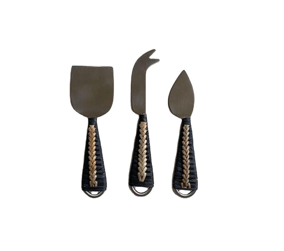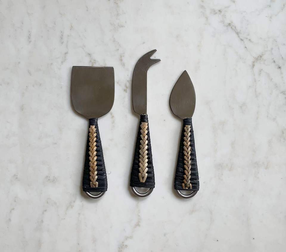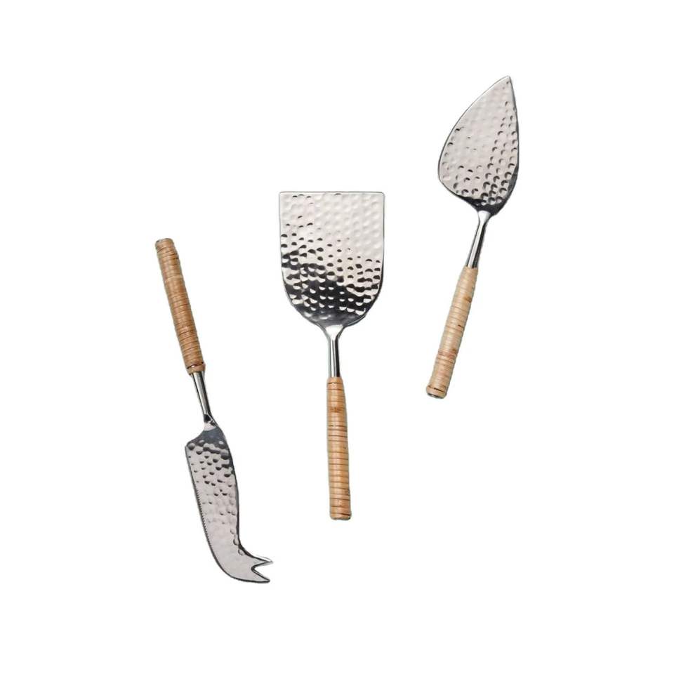 ชุดมีดหั่นชีส3ชิ้นอุปกรณ์ในครัวด้ามหวายและมีดหั่นชีสทำจากสเตนเลสสตีล