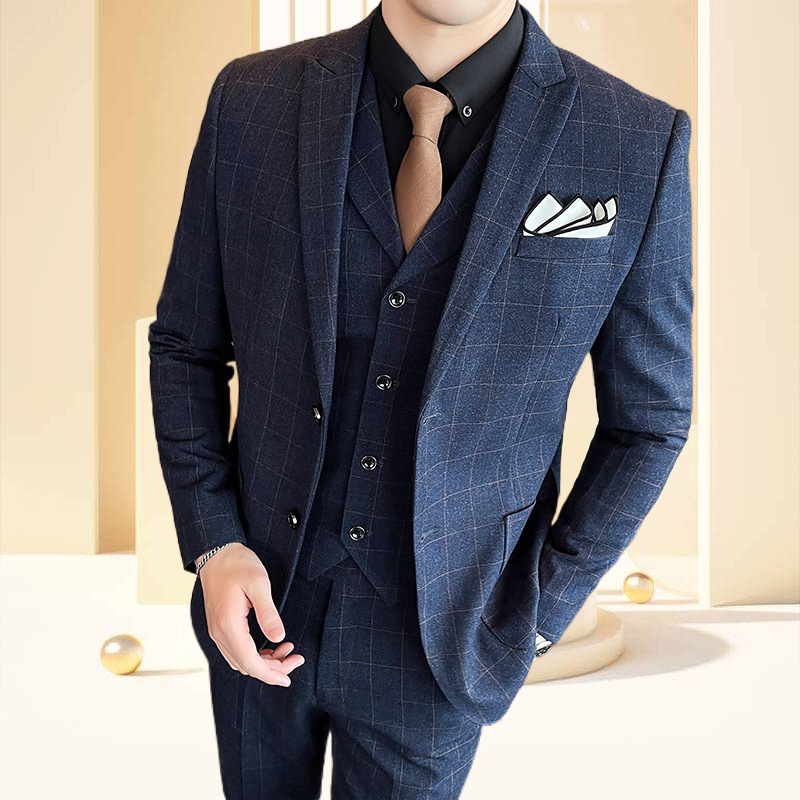 ชุดสูทผู้ชายสไตล์เกาหลีทรงเข้ารูป ไซส์ใหญ่ สำหรับฤดูใบไม้ร่วงและฤดูหนาว ลดราคาพิเศษ ชุดแต่งงานเจ้าบ่าว ชุดธุรกิจลายสก็อต ผ้าวอร์สเตด สามชิ้น