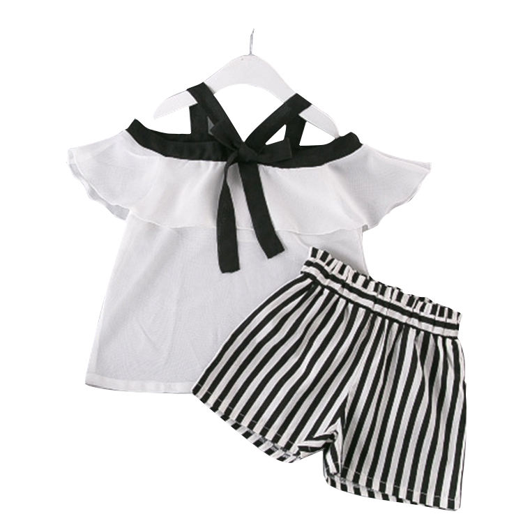 ชุดเสื้อผ้าเด็กผู้หญิงลดราคา เสื้อแขนกุด+กางเกงกระโปรงลายทางพิมพ์ 2 ชิ้น ชุดเสื้อผ้าเด็กผู้หญิงสไตล์บูติก