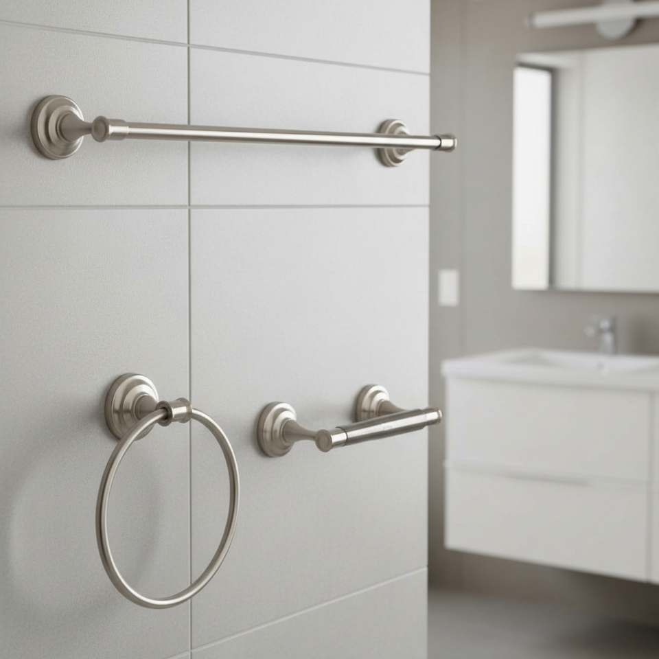 ชุดอุปกรณ์ห้องน้ำเหล็กคลาสสิก ลดราคาพิเศษ ที่วางกระดาษชำระ ถาด ราวแขวนผ้าเช็ดตัว และห่วงแขวนผ้า จากเวียดนาม