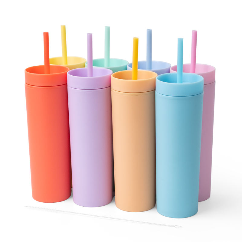 แก้วน้ำเก็บความเย็นสีสันสดใส ขนาด 16 ออนซ์ ปลอดสาร BPA แบบสองชั้น ทรงเพรียวบาง ผิวด้าน ขายส่งพร้อมฝาและหลอด