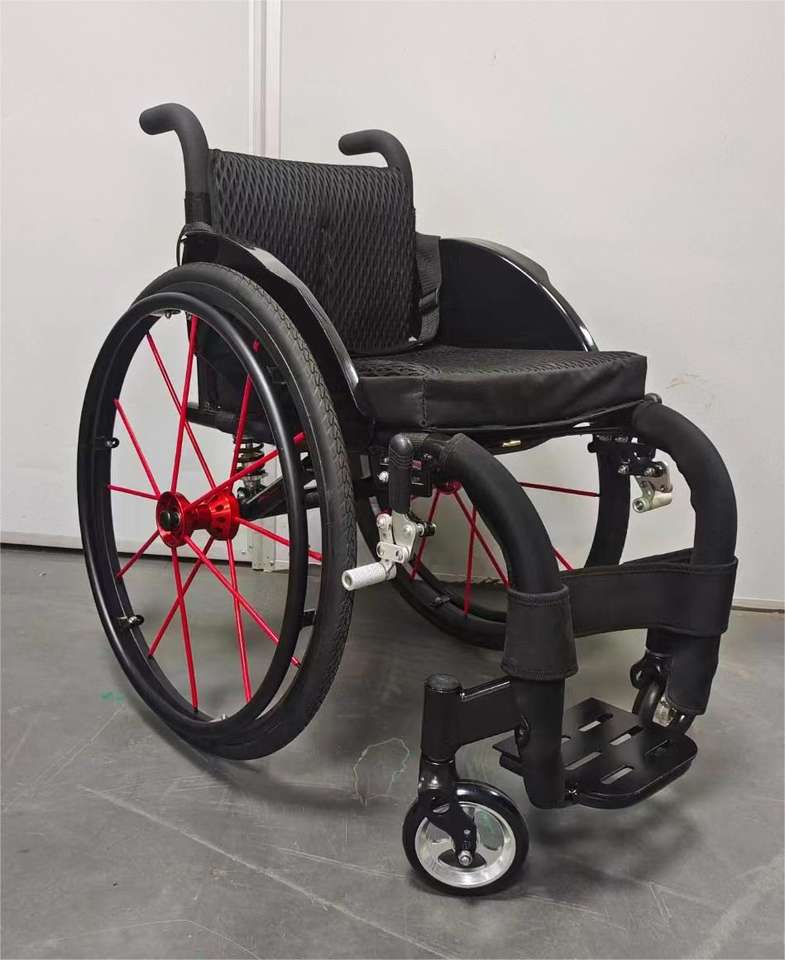 รถเข็นคนพิการพร้อมเบาะนุ่มพับน้ำหนักเบาใส่สบายสำหรับกิจกรรมกลางแจ้งนั่งรถเข็นเล่นกีฬา