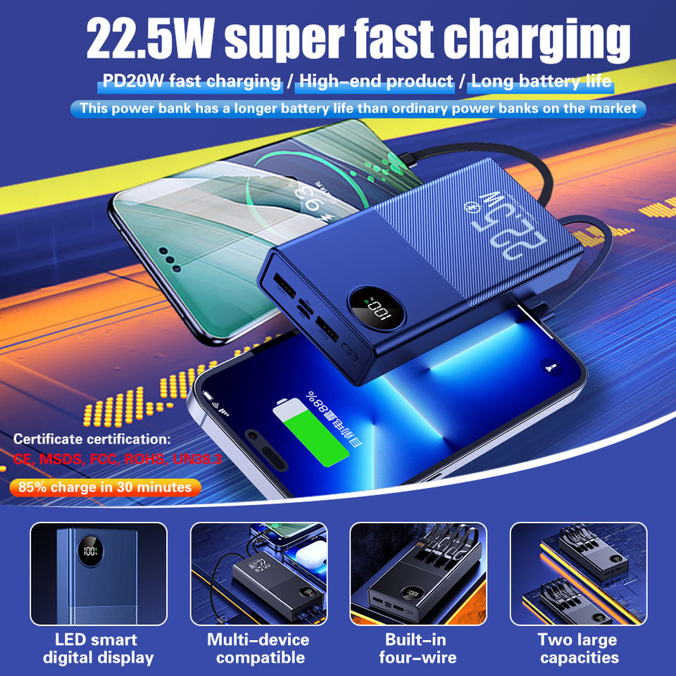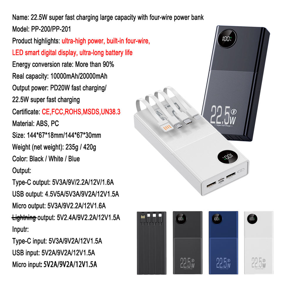 แบตสำรองชาร์จเร็ว22.5W 10000mAh สำหรับโทรศัพท์พร้อมสายชาร์จเร็ว4 in 1แบบพกพา20000mAh สำหรับเป็นของขวัญ