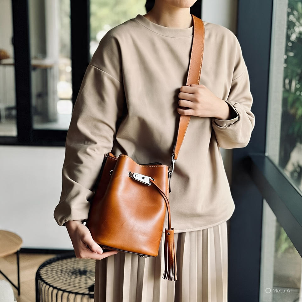 กระเป๋าสะพายข้างทรงถังทรงเรขาคณิตสไตล์โบฮีเมียนหนังแท้สีน้ำตาลออกแบบได้ตามต้องการมีกระดุมติดซิปสำหรับผู้หญิง