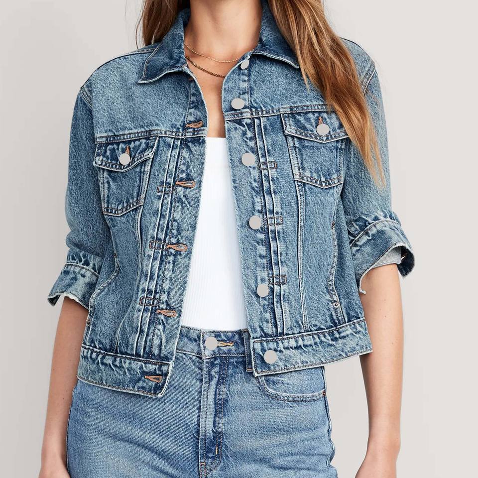แจ็กเก็ตยีนส์แขนยาวของผู้หญิงแจ็กเก็ตยีนส์มีกระเป๋าทำจากผ้าฝ้าย