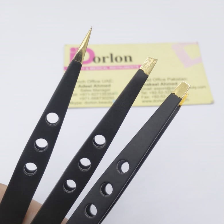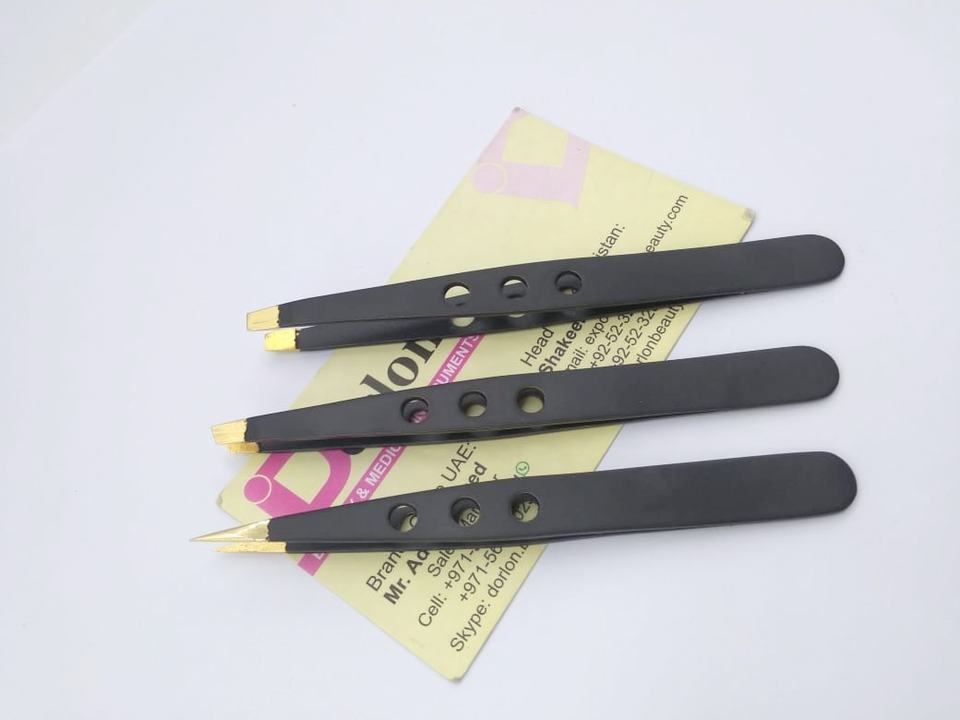 ชุดแหนบคิ้ว3ชิ้นสีดำสีทองออกแบบโลโก้ได้ตามต้องการชุดแหนบคิ้วแบบ3รูออกแบบได้อย่างยั่งยืน