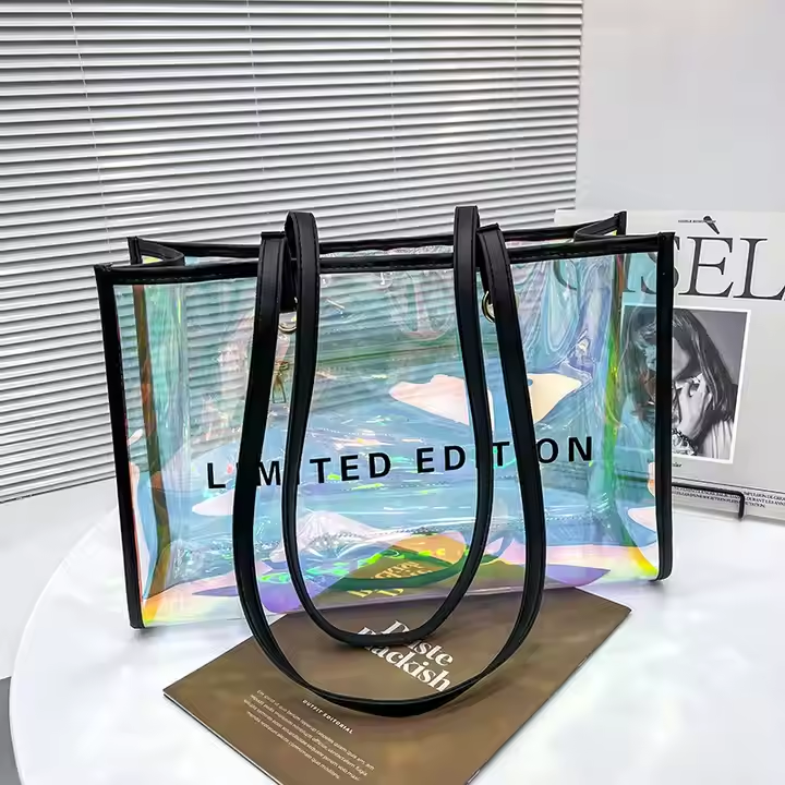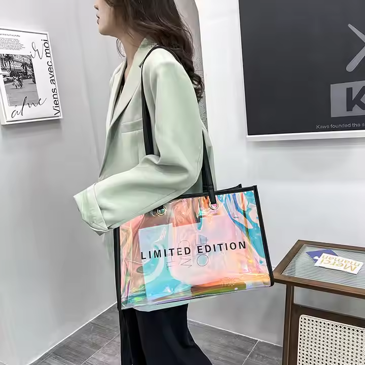 กระเป๋าช้อปปิ้ง PVC โฮโลแกรมเลเซอร์แบบกำหนดโลโก้เองพร้อมที่จับหนัง PU