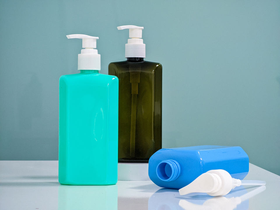 ขวดเครื่องสำอางพลาสติก PET สีส่วนตัวพร้อมปั๊มสำหรับบรรจุภัณฑ์แชมพูและโลชั่นโลโก้ออกแบบได้ตามต้องการ