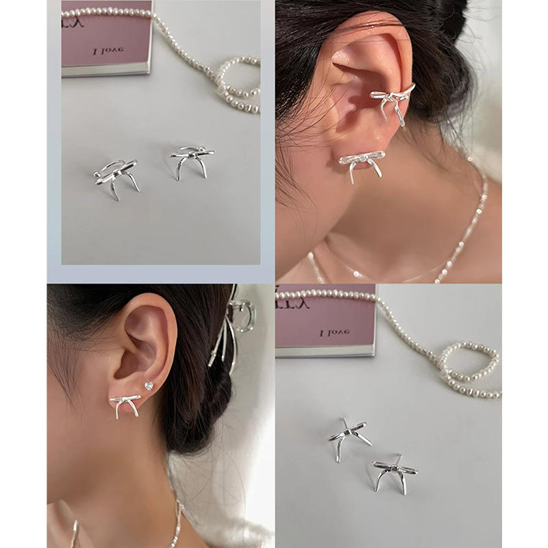 ต่างหูแฟชั่นแบบไม่เจาะสำหรับผู้หญิงต่างหูรูปโบว์ชุบโลหะเงินแบบไม่เจาะ
