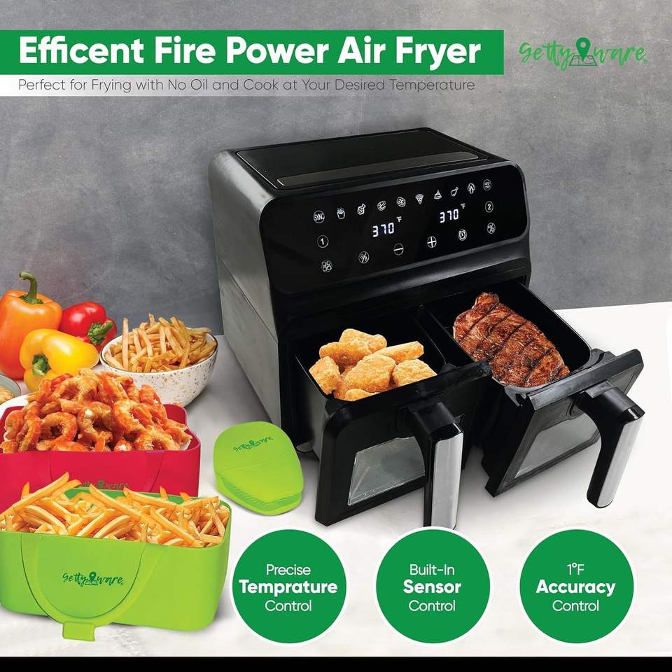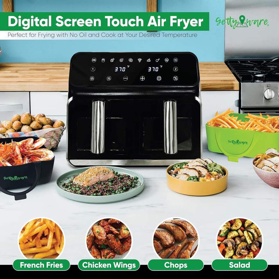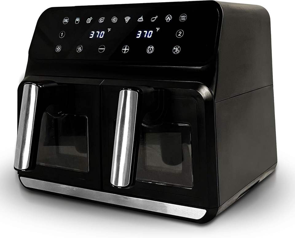 ทำความสะอาดง่าย, ประหยัดพลังงาน, ทำอาหารได้อย่างรวดเร็ว, การควบคุมที่แม่นยำ, ความเก่งกาจ, หม้อทอดลมตะกร้าคู่ลักษณะ