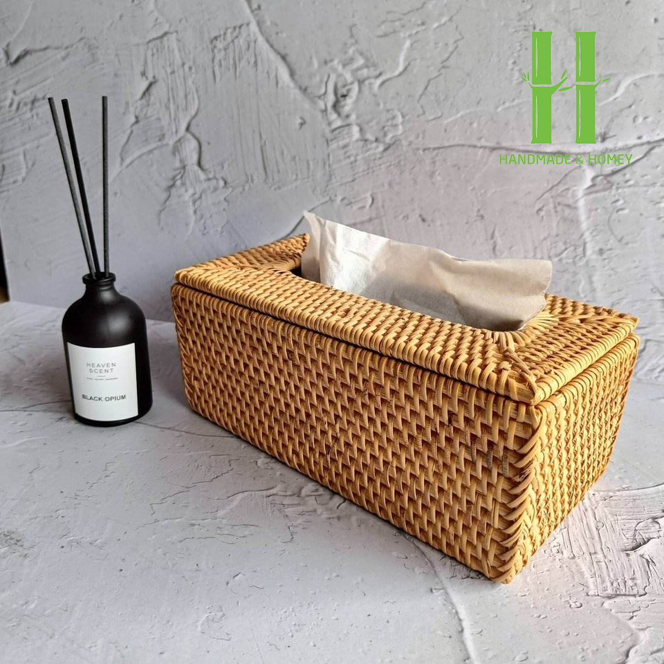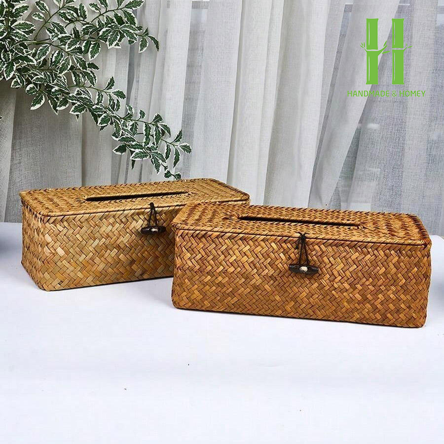 กล่องทิชชู่สานจากไม้ไผ่หวายสี่เหลี่ยมวัสดุธรรมชาติทนทานอุปกรณ์เสริมสำหรับวางผ้าเช็ดปาก
