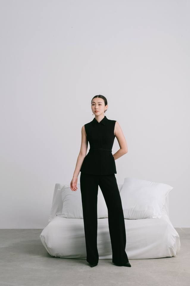 กางเกงและกางเกงผู้หญิงผ้าโพลีเอสเตอร์40% 60% อะซิเตทสีดำหรูหรามีกระเป๋า