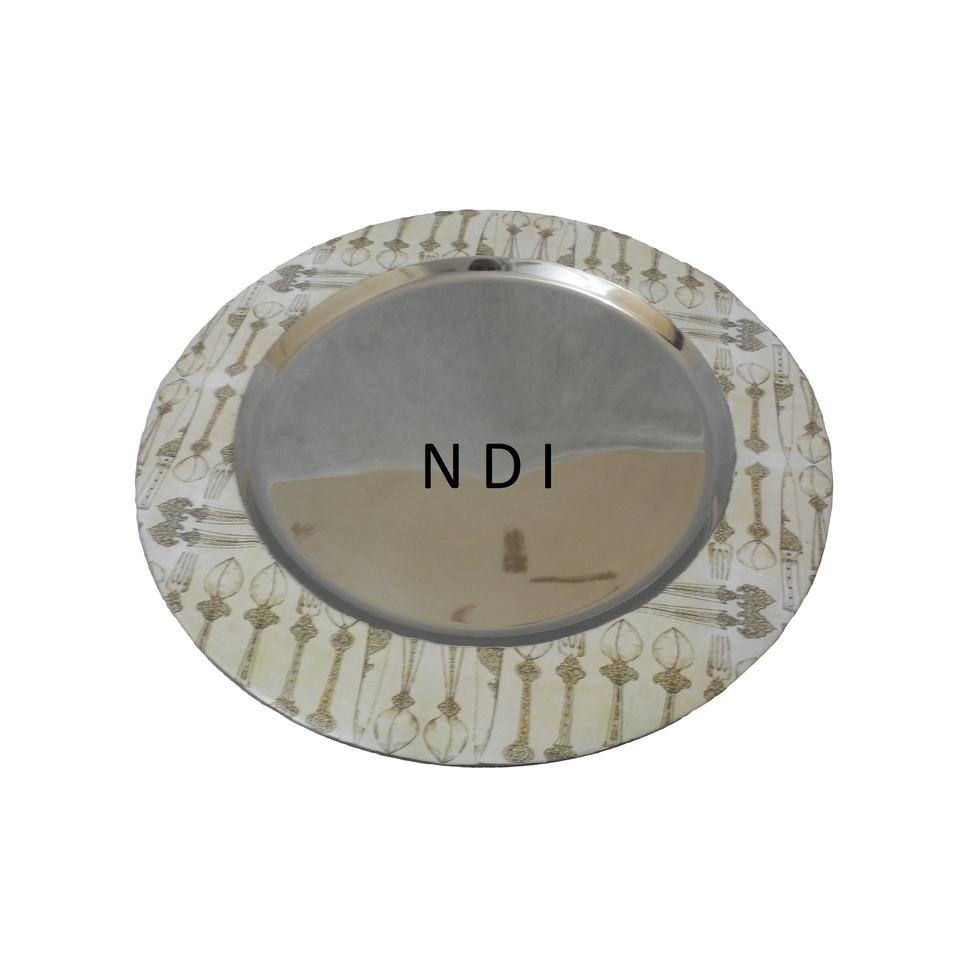 จานรองอาหารสแตนเลสเคลือบลายพิมพ์ขอบเคลือบเงา ดีไซน์สวยหรู สำหรับโรงแรมและงานจัดเลี้ยงที่บ้าน ราคาถูกที่สุด