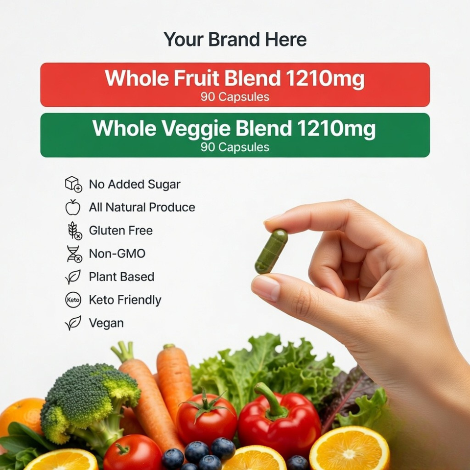 ผลิตภัณฑ์เสริมอาหารผลไม้และผักยอดนิยม ผลิตจากซูเปอร์ฟู้ดจากธรรมชาติ บรรจุแคปซูลผัก 90 แคปซูล และผลไม้ 90 แคปซูล
